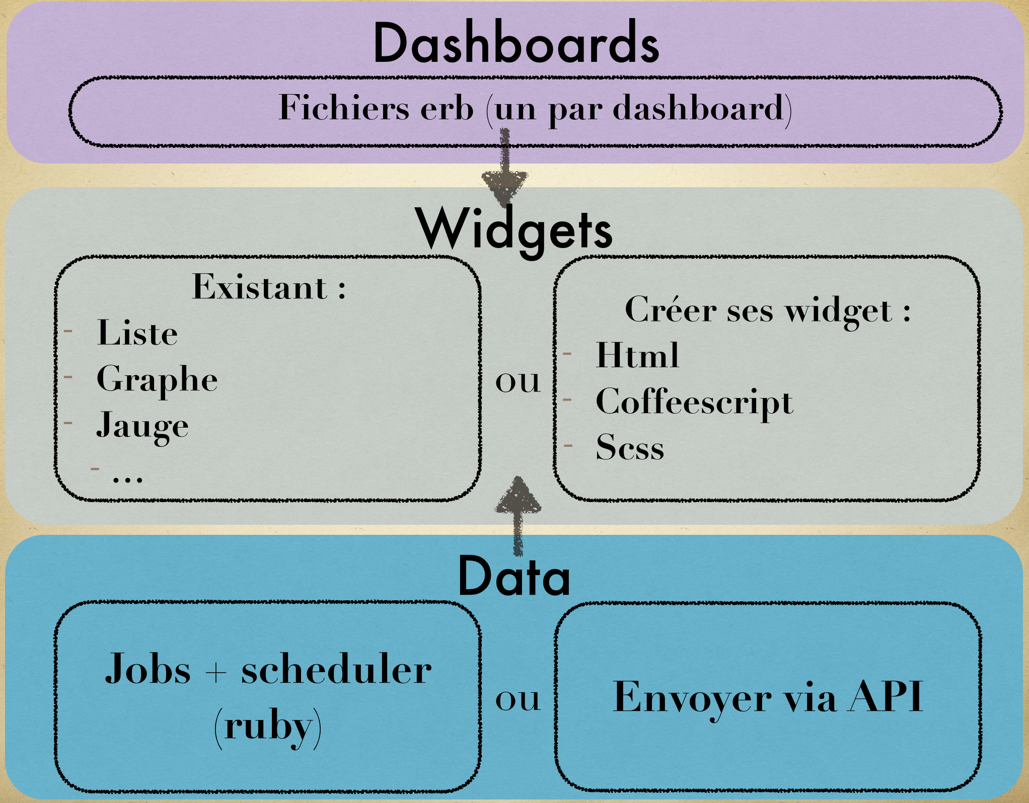 - enfin pour envoyer la donnée nous pouvons soit l’envoyer directement via un appel POST en HTTP, soit créer un job en ruby dans dashing.