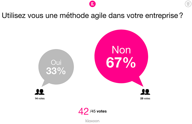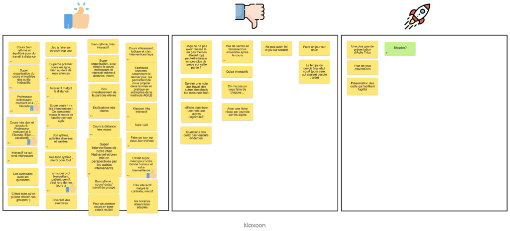- Des interviews : durant la formation j’ai fait intervenir Alice pour nous présenter son rôle de ScrumMaster, Moïra le métier du coaching et Florence son rôle de Product Owner (merci infiniment à toutes les trois ! ). Les étudiants posaient des questions via Klaxoon et je relayais celles-ci. Les trois interviews ont beaucoup plus et j’ai eu de super retours, cela rend vraiment très concret les notions vues auparavant.