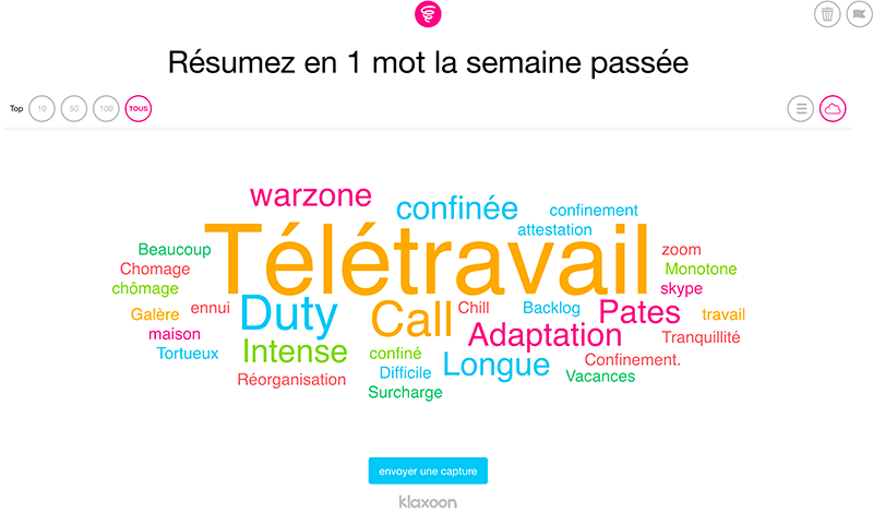 - Klaxoon pour tout ce qui est interaction globalement avec les participants. J’ai demandé aux participants de l’ouvrir à côté (onglet ou smartphone, tablette) et de le garder ouvert. J’en reparlerai plus bas mais vraiment Klaxoon est excellent pour garder le contact et pour pousser du contenu.