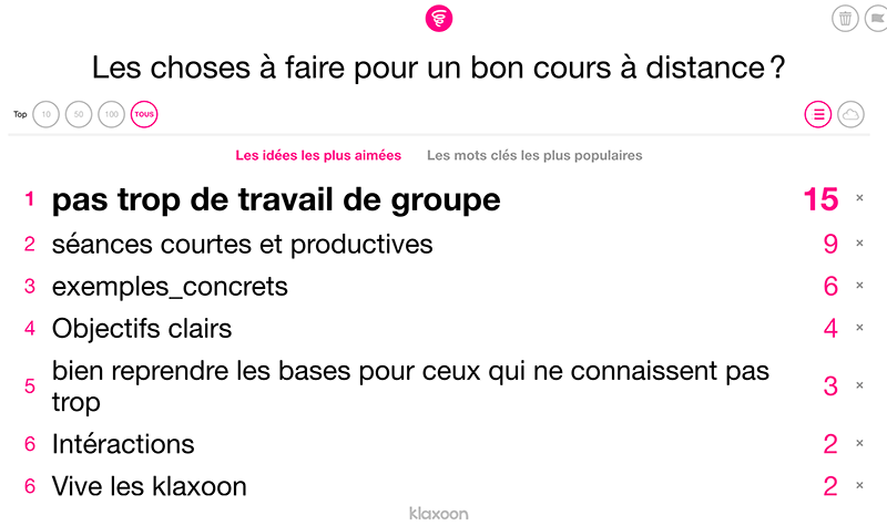 - Des quizz très régulièrement (1 à 2 par demi-journée), même très basique, cela permet de s’assurer que l’on a bien été compris et cela favorise l’apprentissage par la répétition. Mention spéciale pour les « aventures » sous Klaxoon qui ont beaucoup plus. Ce mode permet d’introduire un peu de challenge dans les quizz en affichant en temps réel les résultats, idéal pour démarrer la matinée en se rappelant les éléments de la veille.